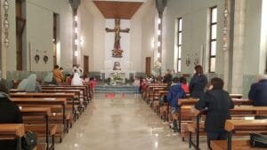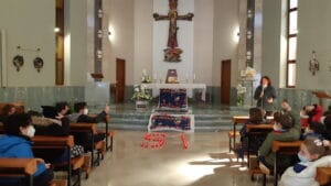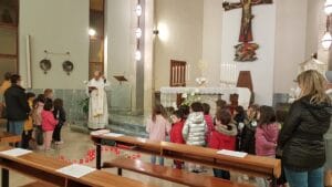 In particolare, giovedì 24 sono venuti i ragazzi della scuola primaria paritaria che accompagnati dalle loro insegnanti hanno riflettuto sul significato del SI di Maria di Nazareth, disegnato con lumini rossi ai piedi dell’altare e circondato da cinque bandiere della pace.