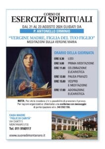 A partire dal mattino di mercoledì 21 agosto fino alla sera di venerdì 23 agosto 2024, presso la Casa Madre delle suore di Montanaro si svolgerà un corso di “Esercizi Spirituali aperto a tutti” e guidato da padre Antonello Erminio. Tema: Vergine Madre, Figlia del tuo Figlio. Nella locandina che segue, il programma delle giornate e le meditazioni.
