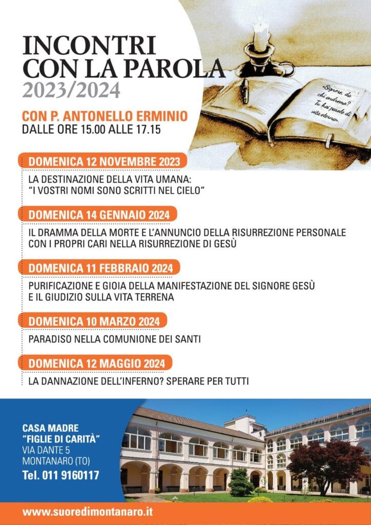 Domenica 12 novembre 2023, in casa Madre, riprendono gli incontri con la Parola guidati da P. Antonello Erminio. Segue la locandina con le date e i temi delle giornate. La partecipazione è aperta a tutti.